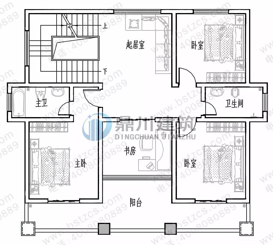 二 層:起居室、臥室(附衛生間,陽臺)、臥室(附陽臺)、臥室、書房、衛生間