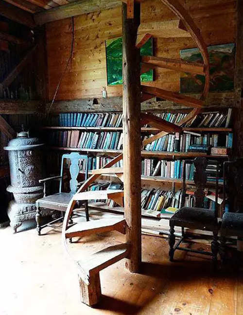 木質(zhì)的旋轉(zhuǎn)樓梯以及木質(zhì)的書架和地板都讓整個空間充滿淡淡的寧靜感。加上墻面上滿滿的書籍讓整個身心都瞬間沉靜下來。旋轉(zhuǎn)樓梯下方的空間可以設(shè)計成各種各樣的,不必拘泥于書房這樣的設(shè)計。