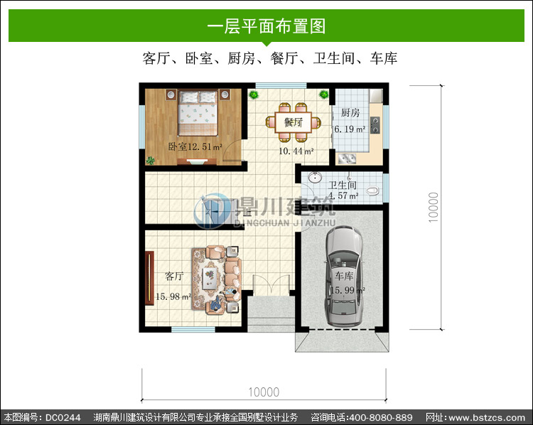 | 一 層: | 客廳、臥室、廚房、餐廳、衛生間、車庫 | |||